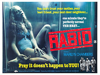 We have the yummy, "porn actress gone straight" Marilyn Chambers playing Rose, a girl who is badly injured in a motorcycle accident with her boyfriend. She's trapped under the cycle and suffers some major injuries. The accident happens next to the Keloid Clinic - a plastic surgery clinic that is trying some new skin graft treatments. Needless to say, something goes really wrong with the procedure and the outcome and Rose is turned into a vampire-like creature with a need to feed. Her feeding - unique in and of itself - transfers a rabies-like disease into it's victims. Chaos ensues.